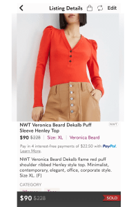 To put McIndoe’s words to the test using advice from the guide, I sourced this House of Harlow 1960 for $35 and sold it for my full asking price of $100. I also sourced this Veronica Beard top online for $28 and accepted a $90 offer from a liker, both resulting in a quick flip and easy profit.